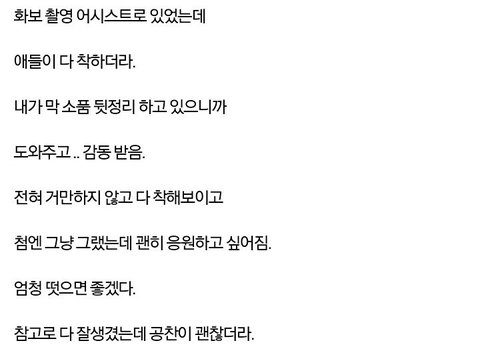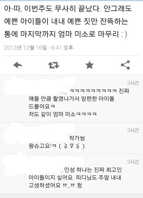 솔직히 방송작가나 피디가 대놓고 트위터에서 이쁜이들 이러면서 칭찬하는 아이돌은 거의없는데 비포는 너무 많아서 찾을려면 시간걸릴정도...콘서트관계자분 피디님 작가님 방송스텝님 심지어 빅스도 다 비포 칭찬하고 내가 팬질하면서 이렇게 인성좋은그룹은 거의 처음임T.T 예전에 내가수는 쫌 사건사고많아서 가슴졸였는데 비포는 그런 걱정없음ㅠㅠ요런 이쁜아가들같은이라구