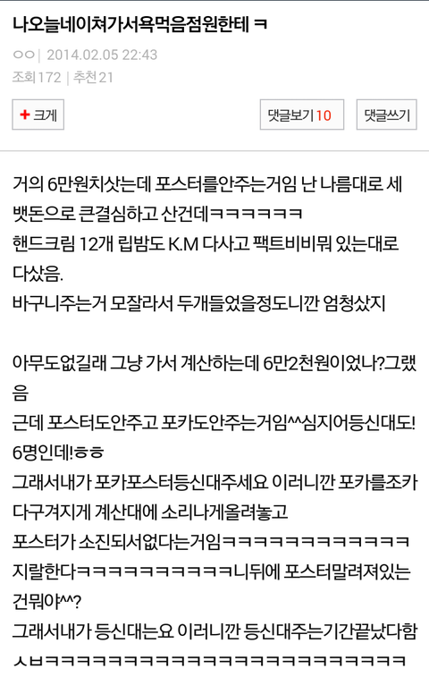말이되는소릴해라; 그래서 12개에 62000원이냐고 물어봤더니황급히댓칸에다m만샀다그러더라m만샀는데도다른물건까지합해서62000원이니
