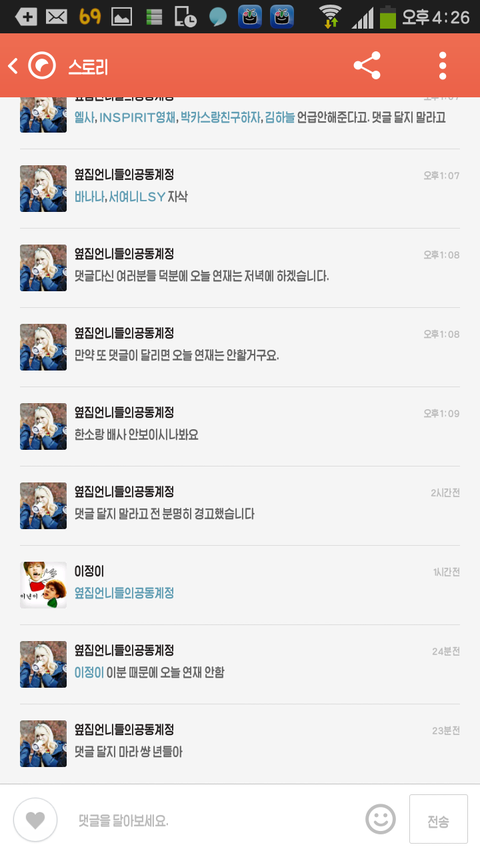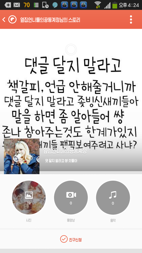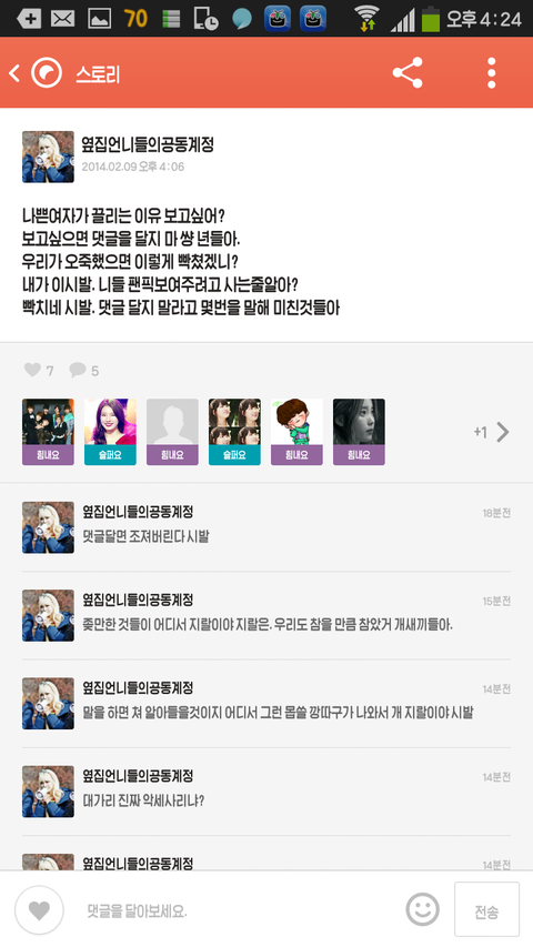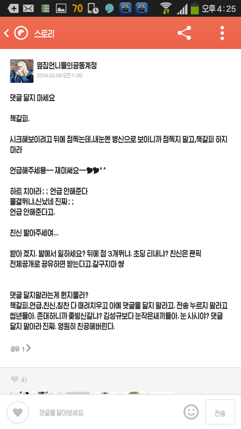 도대체왜이런데? 내용도보니까 무슨지가 나쁜여자고 엑소가지한테들러붙는그런 그지같은내용인데 존2나 ㅂㅅ같음진짜 ㄹㅇ망상증있는듯 불쌍; 그래놓고 공유좀타니까 별의별쌍욕에ㅋㅋㅋㅋㅋㅋ막나가네ㅋㅋㅋㅋㅋㅋㅋ초딩들이재밋다재밋다 하니까눈에뵈는거없는듯;