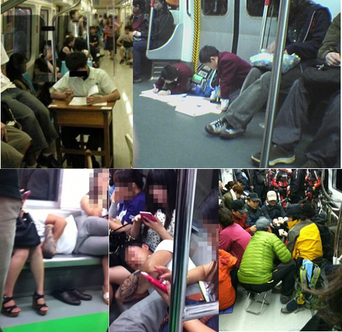 북적북적한 대중교통 이용 중 시간 때우는 유형도 가지각색입니다.
