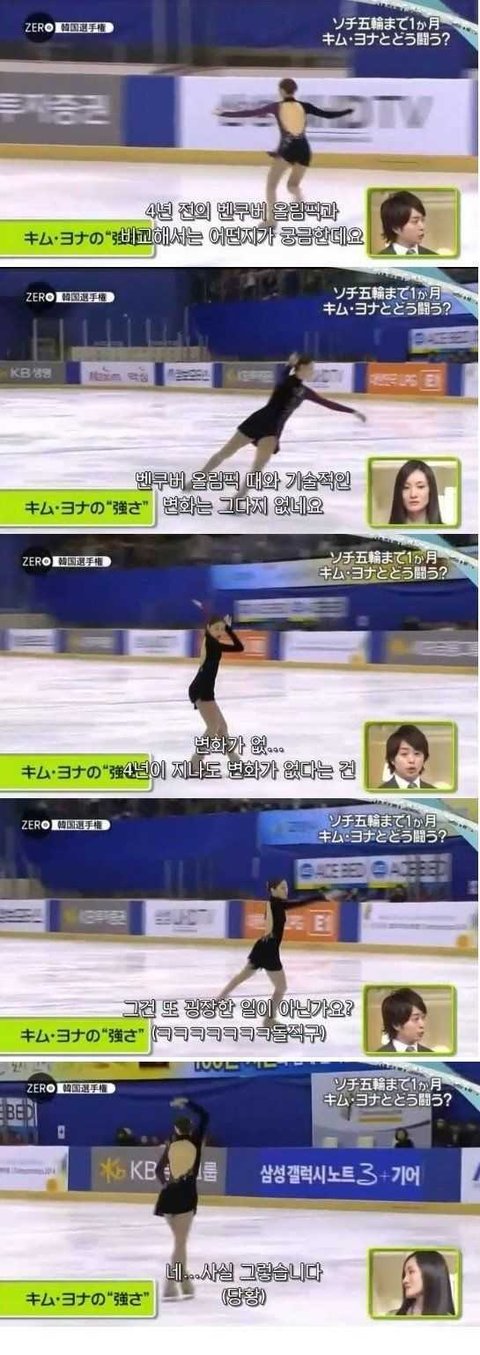남자엠씨( 사쿠라이 쇼?)가 김연아 경기보고 여왕의 귀환이라며 어떠냐고 질문하자 토리노 금매달리스트인 아라카와 시즈카가 별로 변한게 없네요 라고 디스(이 처자 지난번에 김연아 극찬했다가