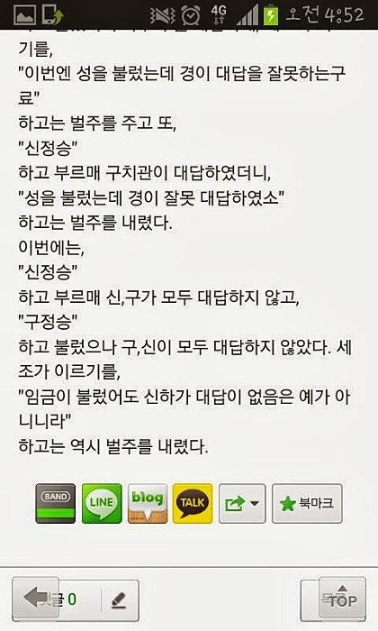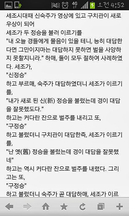 신숙주가 저기서 팔씨름을 함. 처음엔졌다가 다시했을땐 이김. 세조는 지가 좋다해놓고선 기분나빠함. 술김에 본심이 나온것이라며 자기를 무시한게 아닐까함. 한명회는 세조의 그 마음을 알곤 신숙주였나? 신숙주의 아들인가 종인가 여튼 신숙주네 사람에게 말해서 촛대를 치워버림. 신숙주는 매일 밤 일어나서 책을 읽는 버릇이 있는데 술취한 그날도 밤에 책읽으려는데 촛대가 없어서 포기하고 자버림. 세조는 몰래보낸 신하에게서 신숙주방 불이 꺼져있단 소리를 듣고 안심했다는 이야기가 있음.