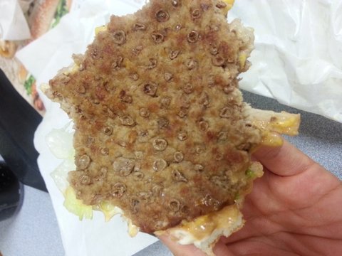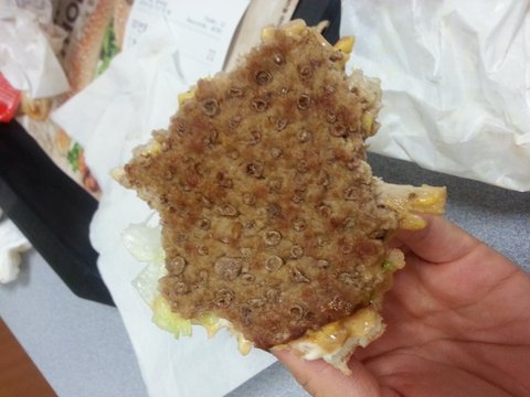버거군주 필리치즈와퍼 먹다가 빵이 빠져서 패티를 보게됬는데... 이거 패티가 왜이렇게징그럽게생겼죠??