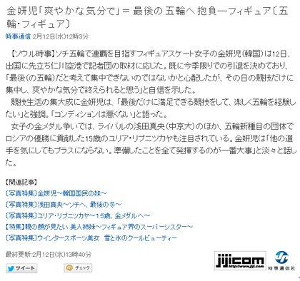 【서울 시사】 소치 올림픽에서 연패를 목표로 피겨스케이트 김연아(한국)가 12일 출국에 앞서 인천 공항에서 기자들의 취재에 응했다. 이미 이번 시즌을 끝으로 은퇴를 결정하고, "마지막 (올림픽)이라 집중력이 떨어질까 걱정했지만, 그날 경기에만 집중하고 상쾌한 기분으로 끝내고 싶다."라고 자신감을 보여 주었다.