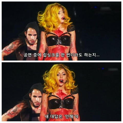 한에스크에서 소녀팬이 가가에게 맨날 손목긋고 운다고 고민털자 가가가'그럼 너손목을긋지말고 내손목을 내눈을 바라보면서 그으렴'이라말하면서 자신의 손목을 건네주었