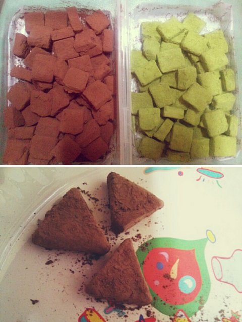 저는 상온에 넉넉히 반 나절 냅둔 뒤, 자르고 코코아&녹차가루 옷을 입혀줬어요.