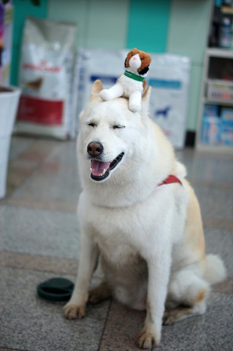 고양이 인형을 머리 위에 올리고..ㅋㅋ 빙구 빙구