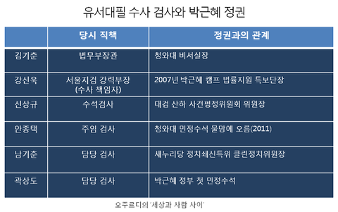 수사 검사였던 남기춘. 서울서부지검 검사장 출신으로 대선 직전 박 대통령에 의해 새누리당 정치쇄신특위 클린정치위원장을 지냈던 ‘친박 인사’다. 또 다른 수사 검사였던 곽상도는 박근혜 정부가 들어서자 청와대 민정수석으로 발탁됐다.