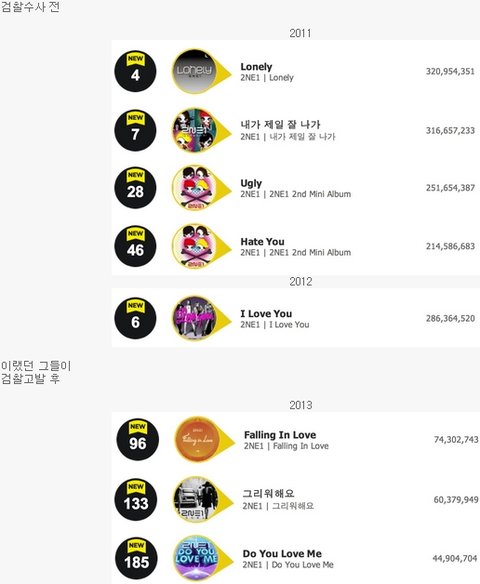 단적으로 보여주는 예 : 매일 같은 시간인 아침 10시에, 10장씩 똑같은 판매량을 보이던 2ne1의 음반은,관리자의 조사발언 이후, 차트에서 완전히 자취를 감춘다. 발언 이후 0장 판매