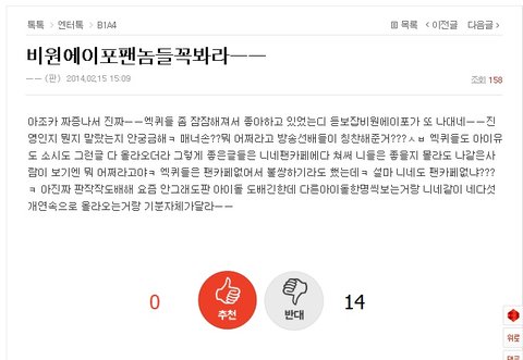 B1A4톡 활성화 안되서 하루에 글도 몇개 안올라온다 병신아 그 몇안되는글이 어떻게 톡에올라갔는지 모르겠는데 우리가 뭐 엔톡을 B1A4로 도배를 하면 몰라;;