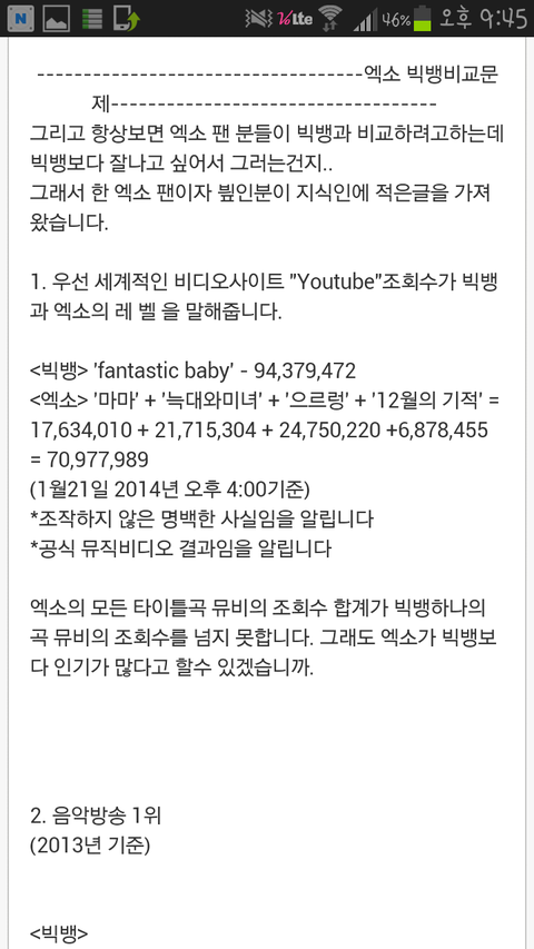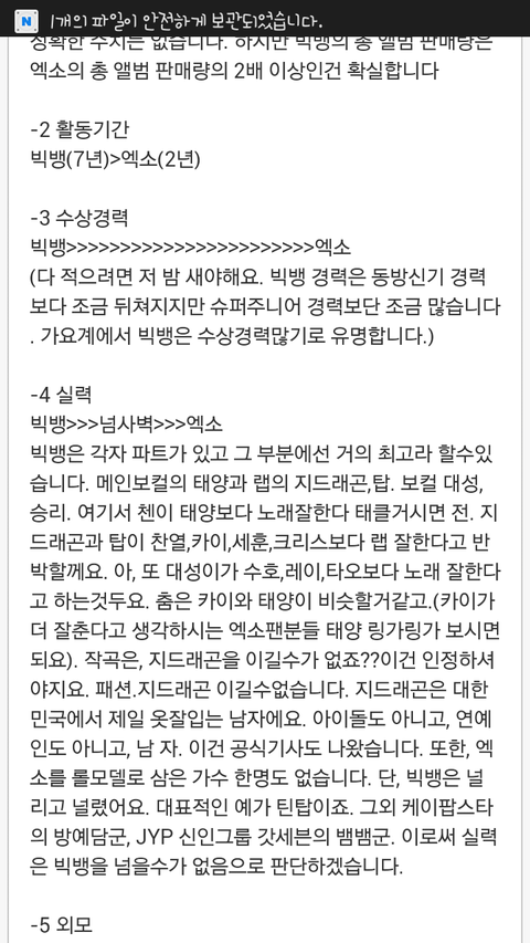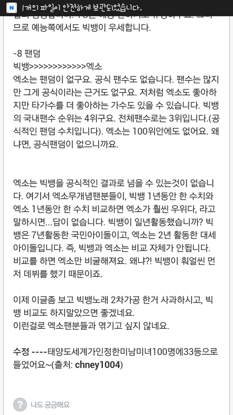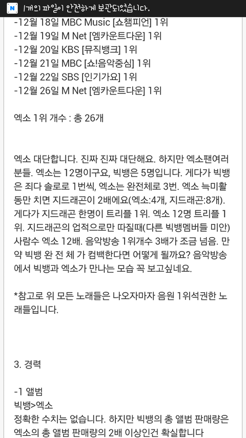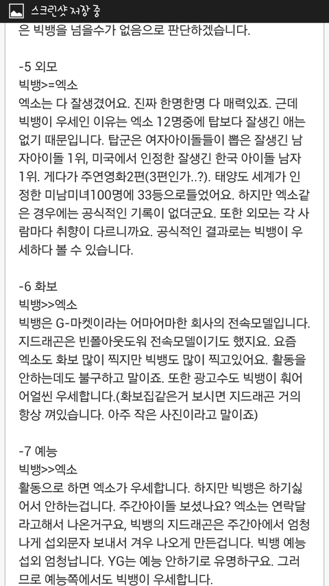 와 정말 이사진보고 화나서 죽을뻔했습니다. 빅뱅 bad boy는 엑소가 데뷔하기 전인 2012년 2월에 나온곡이고 ,누가뭐래도 빅뱅곡입니다. 근데 저게 말이됩니까. 와 정말 엑소설렘송 ? 저희가 으르렁을 2차가공해서 빅뱅 설렘송 비포설렘송 이런식으로 퍼트리시면 좋으시겠어요 ? 심지어는 네이버 검색창에 배드보이 라고 쳐도 빅뱅거다 라는 검색어와 승리의 솔로곡 지지베 엑소 라고치면 지지베 엑소꺼다 라는 글까지 나옵니다. 정말 팬으로서 이건 너무하다고 보네요. 아 그리고 요새 몇몇 무개념 엓팬들이 빅뱅과 엑소를 비교하시는데 이 사진들 보고 말씀하세요.
