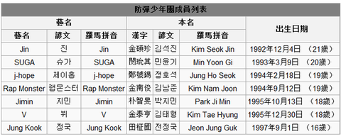 金南俊(김남준) 金碩珍(김석진) 閔玧其(민윤기) 鄭號錫(정호석) 朴智旻(박지민) 金泰亨(김태형) 田柾國(전정국)