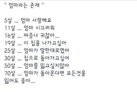 아기를 키우며 느껴요...엄마가 어떤 마음으로 날 키우셨을지...나를 사랑하셨을지...세상에 다시없을 사랑으로 저를 먹이고 입히고 키워주셨겠죠...엄마가 있다는건 세상에 절대적인 내편이 있다는거고..전 정말 로또 맞은 건 비교도 안될만큼 행복한 거라 말씀드리고 싶어요..