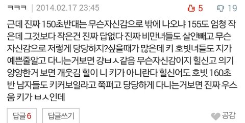 댓글 보니깐 글과는 상관없이 그냥 150대는 여자로도 안보인다, 너무 작다, 150은 비율이 좋을 수가 없다 등과 같은 말이 많고 좀 심한 말도 많더라구요..