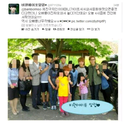 그외에도 콘서트에서하는말이랑 팬서비스 방송국에서 일일이 스텝들한테 인사열심히하는모습 사랑의리퀘스트?방송에서 자신들이 후원하게된 어느아저씨 자식의선물도 챙겨간아이돌 콘서트때 화환안받고 좋은일하겠다며 기부부스를 만들어달라한아이돌..팬들비맞는데 자기들도우산쓸수없다며 같이우산안쓰고비맞는아이돌 수상소감에서는 팬으로시작해서 팬으로끝나는아이돌 너무많아..아진짜 B1A4는 사랑입니다 출구?따위없움 입구 징짜 넓음★☆니들땨매공부도못해ㅠㅜㅠㅜ원랴안하지만..?ㅎ B1A4많이사랑해주세요ㅜㅜㅠㅠ