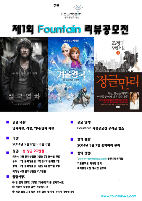 안녕하세요, Fountain 문화콘텐츠 웹진에서 『제 1회 Fountain 리뷰 공모전』을 개최합니다.