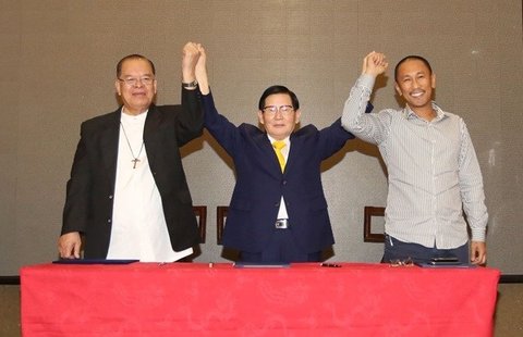 (왼쪽부터 카톨릭 대표 다바오 전 대주교, 민간평화단체 이만희 대표, 오른쪽 이슬람 대표 이스마엘 주지사) 이만희 대표와 필리핀 카톨릭, 이슬람 대표가 전쟁종식 세계평화 협약서에 서명하고 손을 들어보이고 있다.