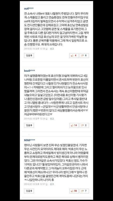 짜증나 해줄 수 있는게 없어서 속상하네요.. 사람들은 전체 사건을 잘 알아보시고 말씀하셨으면 좋겠네요 박효신 오랫동안 지켜봐 온 팬으로서 박가수 절대 누구 등쳐먹고 그런 짓 할 사람 아닙니다 돈 벌려고 연예인 시작한 것도 아니고 노래하고싶어서 가수한 사람이 돈에 이렇게 쫒길 줄이야ㅠㅠ 왜 이렇게 착하고 바르게 산 사람에게 이런 일이 생기는지 참;ㅁ; 그래도 일어날 겁니다 갓효신 ♡