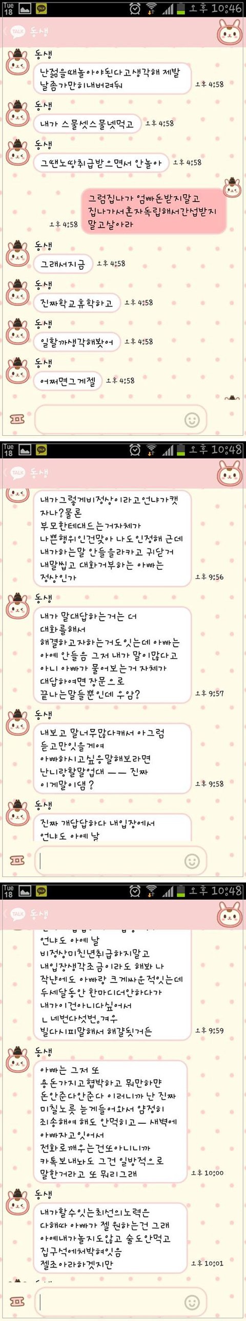 톡되서 놀랐네요 예전에도 조언부탁드리는글 올려서 톡된적 있는데 이번에도 많은 분들이 공감하시는 문제였나봐요. 그래도 제 기준이 잘못된게 아니라서 다행이네요 저는 내심 요즘엔 다 그렇다 니가 보수적인거다 이런말나올까봐 걱정했는데. 동생도 글을 봤습니다. 글을 보여줄 생각은 없었는데 톡이 되고나서 동생 친구가 동생한테 알려줬나보더라구요. 처음에 자기 망신시켜줘서 고맙다며 자기 친구랑 같이 글 내용 어이없다는 식으로 대화한걸 캡춰해서 저한테 보냈더라구요. 단면만 올려놓고 깠다고, 자기 친구랑 대화한걸 왜보냈는진 모르겠는데 저도 그 대화보고 확 폭발했습니다. 어쩜 자기잘못한거 반성은 조금도 할줄 모르고 이런 철없는 소리부터 할 수 있나 싶어서 굉장히 실망스럽고 화가 나더라구요.