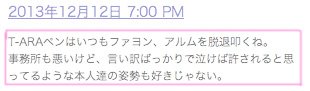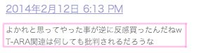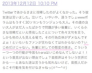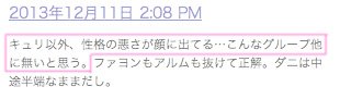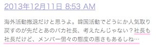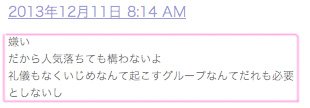 1.일본 현지 한류팬들의 반응은 “왕따 문제 이전에 인성과 태도자체가 문제” 라는 논조가 대세 ( 초기 일본 방송활동에서 불성실한 모습으로 구설수에 오르면서 “매너도 없고 예능감도 없는 그룹” 라는 이미지가 한류팬들 에게 각인 되었다 ).