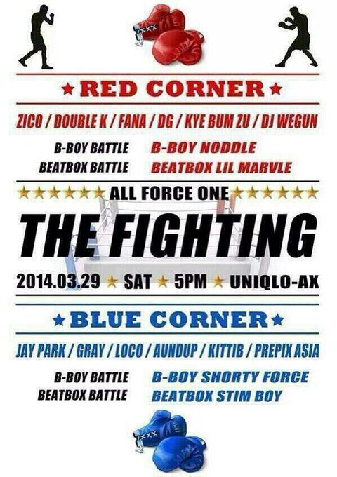 March 29: Zico will be performing at All Force One's The Fighting (Red Corner Team) at Uniqlo-AX