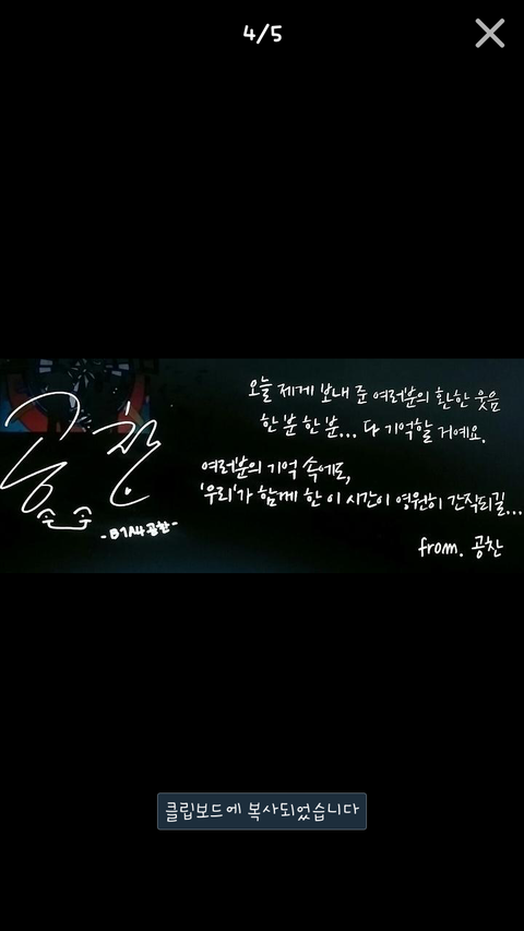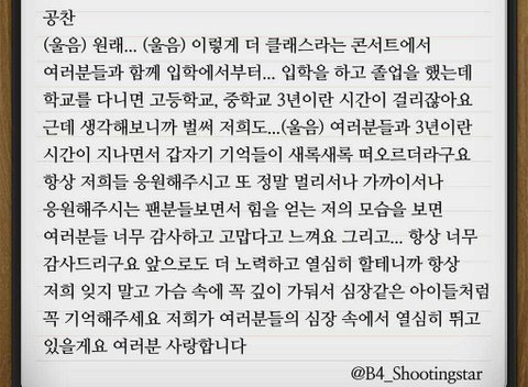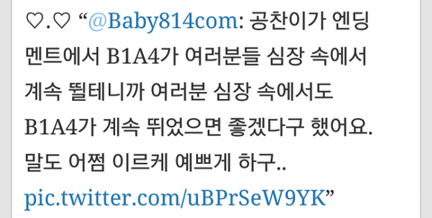 내가 입덕 했을때 까지만 해도 표현 잘 안하고 시크찬이 어울릴정도로 거의 말 잘 안하던 아이였는데 요즘 따라 많이 표현해줘서 고맙고 사랑해... 졸업식 빼고 엉엉 울지 않던 니가 콘서트에 엉엉 울었다고 생각하니까 마음이 아프다.. 우리 때문에 내색도 안하고 또 얼마나 삼켰을까 생각도들고...ㅠㅠㅠㅠㅠ 데뷔때 보다 더 발전한것 같아서 뿌듯하고자랑스러워ㅠㅠㅠㅠ 내가 이래서 출구없는 너를 덕질하나봐!^^