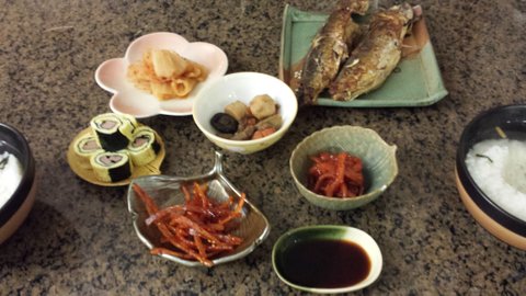 계란말이 고등어 구이 오징어채무침 오징어젖등등
