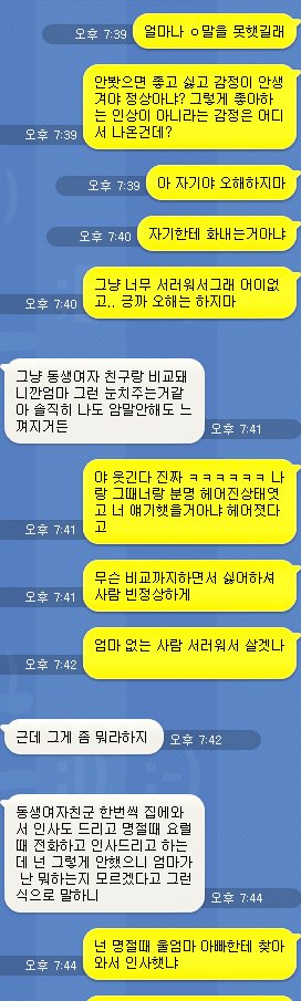 요는 명절즈음은 나랑 헤어져서 서로 연락도 안하던시기인데 그시기에 동생여친은 뭐 찾아오고 인사드리고 문자보내고 잘하는데 너는 안해서 엄마가 나싫어할거다. 그래서 날언제봐서 싫어하냐 하면서... 실랑이를 했는데... 뭔가..이만남을 계속...해야되나........ 궂이 이런놈팽이랑 살면서 속썩이면서 살아야되나.... 단한번도 내편에서서 얘기해준적없는 앤대..얘랑 왜이래야돼지...하는 회의도들고.....