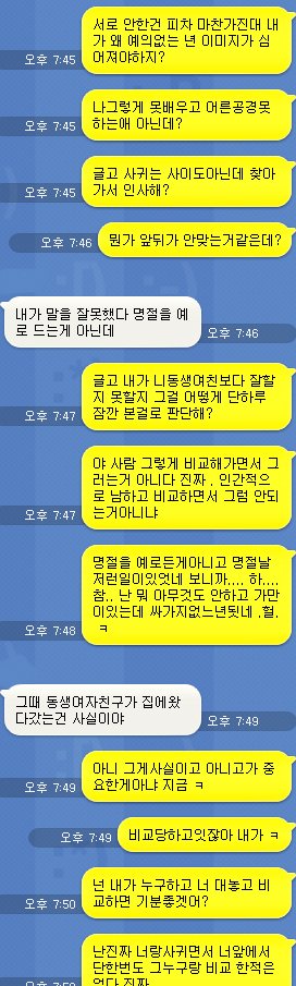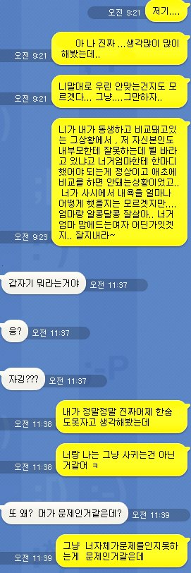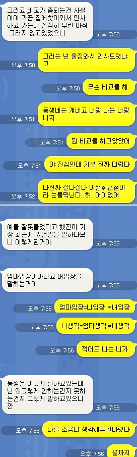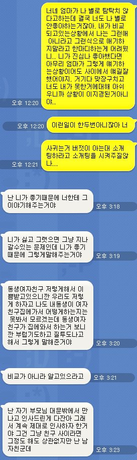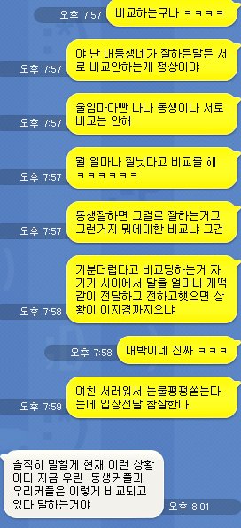 결정적인건 어제 카톡하다가 저랑 동생여자친구랑 대놓고 비교하길래 너무 너무 서럽고 기분상하고 그래서 하소연이라도 해볼라고 글올리는거에요..