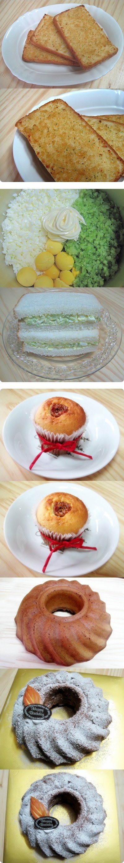 마늘빵, 오이 계란 샌드위치,무화과 머핀, 애플 케이크