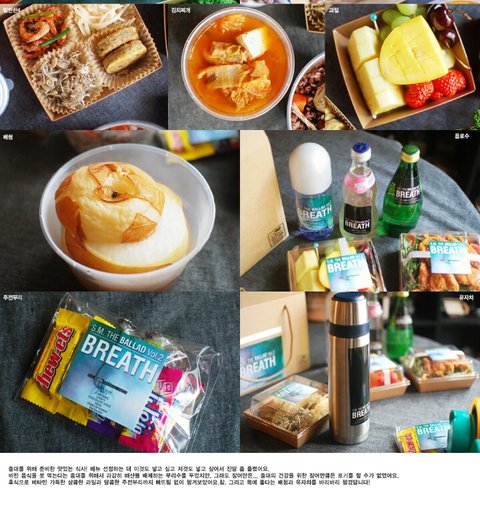이건 종대도시락. 비린걸 못 먹는 종대를 위해 해산물은 과감히 빼셨다는...ㅎㅎㅎ그치만 장어는 포기할 수 없으셨다며 ㅎㅎ 목에좋은 마실것들도