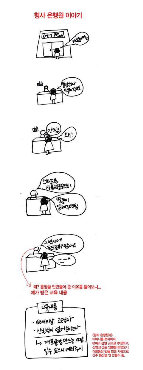 그래서 친구네 어머니는 대포통장을 만드는 사람(60세이상의 고령 또는 신빙성 없이 대답하는 사람)의 예시에 해당되기에 거부 당한거죠.