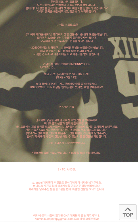 버니드롭에서 민석이 생일서포트 하는거 올라왔나? 여기는 모금하네ㅎㅎ 다들 사이트 들어가봐아ㅎㅎ http://xiumin.kr/angel/