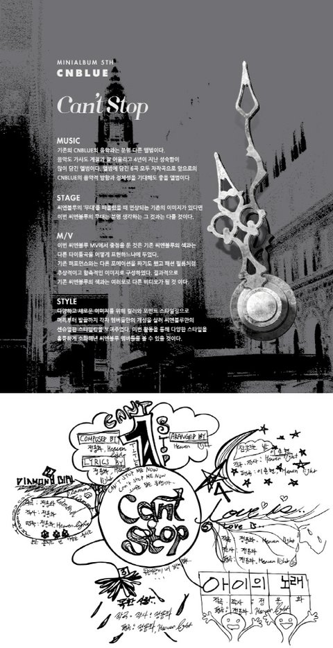 먼저 정용화표 ‘트랙리스트 맵’은 씨엔블루 신보 ‘캔트 스톱’을 시각화한 마인드 맵 형식으로 눈길을 끈다. 정용화 자작곡 ‘캔트 스톱(Can’t Stop)’, ‘다이아몬드 걸(Diamond Girl)’, ‘독한 사랑’, ‘러브 이즈(Love is…)’, ‘아이의 노래’ 5곡과 이종현 작사작곡의 ‘잠 못 드는 밤’ 등 총 6곡에 대한 느낌을 이미지와 손 글씨로 표현, 새 앨범에 대한 기대감을 고조시켰다.