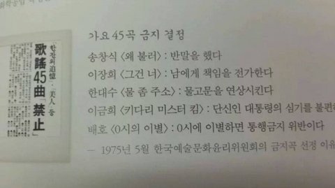 이루어질수없는사랑 / 양희은 사랑이 왜 안 이루어지냐? 거짓말이야 / 김추자 불신감 조장 불꺼진 창 / 이장희 불륜,왜 불이 꺼졌냐? 부정적 아침이슬 / 김민기 '태양은 묘지 위에 붉게 타오르고' 왜? 묘지위냐? 행복의 나라로 / 한대수 그럼 지금 불행하냐? 나비소녀 / 김세화 작곡가 송창식이 예비군훈련 불참 등등
