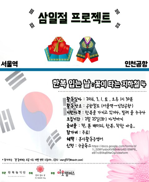 지하철에서는 처음에는 사실 고개를 들기가 힘들었음.. 물론 한복은 부끄러운 옷이 아니지만 익숙하지 않다는 점이 내성적인 나를 그렇게 행동하게 했던 것 같음.. 하지만 몇몇 분들이 미소도 보내주시고 무슨 캠페인 중이냐고 정말 멋진 청년들이라고 응원해 주시면서 점점 뿌듯함이 고개를 내밀기 시작함 ㅠㅠ 순간 한복 입은 내 자신을 잠깐이라도 부끄럽게 생각한 내가 미웠음.. 한국인들이 한복을 입는 다는 건 정말 자연스럽고 당연한 일인데 말임 ㅠ..