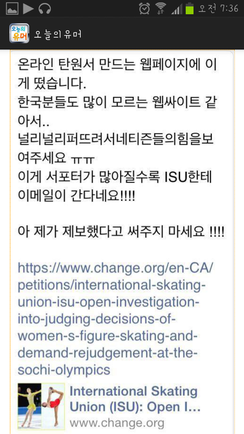 효력이있을지없을지는모르지만 우리나라를위해 수년간 노력해주신 김연아선수를위해서명부탁드립니다 1분도걸리지않아요 https://www.change.org/en-CA/petitions/international-skating-union-isu-open-investigation-into-judging-decisions-of-women-s-figure-skating-and-demand-rejudgement-at-the-sochi-olympics