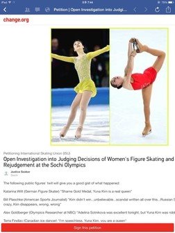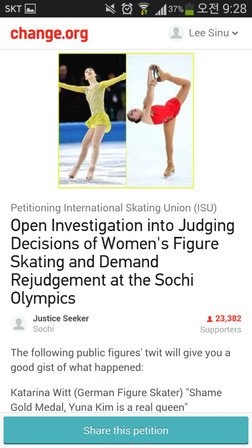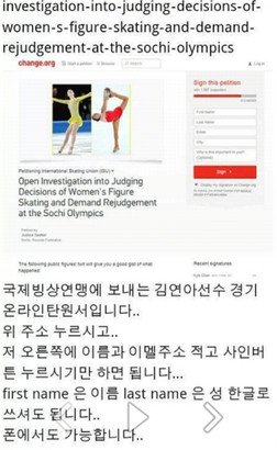 이번 소치 여자피겨스케이팅 편파판정에 대한 ISU 재심사요청 서명운동 모두 동참해주세요.