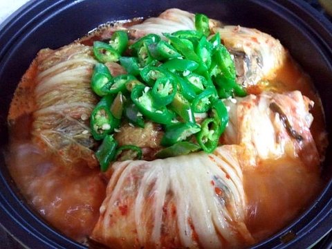 캔 꽁치캔사서 하나하나 배추잎에 말아서 내가 좋아하는 청양고추