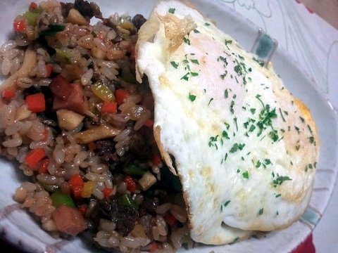 딱히 반찬없을때 햄, 당근,양파,버섯남은거에 굴소스,돈가스소스 좀 넣어 볶은밥