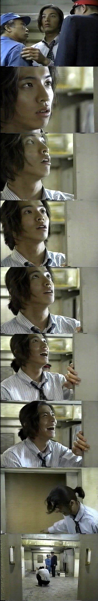 떨어지면서 넥타이가 천장에 걸려버리고...
