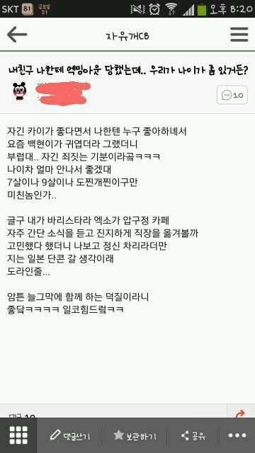 어제 오래된친구에게서 카톡이온거야..내카톡 대화명은 깹송이엿거든 그걸보고선 조심스레 엑소조아하냐고 자기두 쇼타임봣다고넘좋다구 조심스레얘기꺼내더니 알고밨더니 이년도중증인거야 어떻게지냇니?잘지냈니?라는안부보단...넌누가좋니 넌언제부터?이지랄로하루종일 니니랑큥이얘기로 얘기를나누다잠이들었는데 팬톡외엔 사이트도모르는날 인스도알랴주고 등등...(반응좋으면카톡대화올려드림)수많은대화를나누고 잠이든나에게 깨워서 보내준 저스샷두장......난아무잘못도없는데 저런말을듣기시작하였다