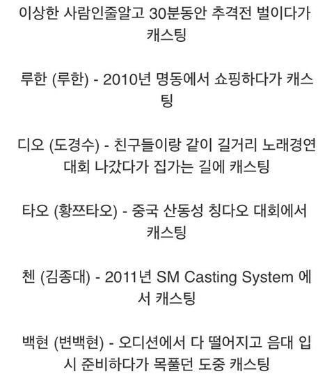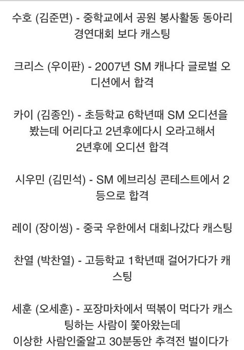 수호,백현,루한,디오는 원래부터 꿈이 가수쪽이여서 어렸을때부터 목관리랑 철저히 했다네요 시우민,첸,카이,크리스는 스엠 대회에서 합격 찬열이는 오래전부터 계속 공개된연습생으로써 여러번 연습생물갈이에도 수호카이세훈과 같이 버텼구요 세훈이도 저후로 잘크는지 6개월마다 스엠에 가서 맡았다니깐 열정이 있었다는거죠 레이는 오래전부터 중국에 노래로 많이 나갔었구요 타오도 랩으로 친구들하고 랩같은 대회나가서 상도탔었구요 오로지 얼굴빨로만 온애들 아니에요 너무 함부로 말 안해주셨으면 좋겠어요 그 큰기획사에서 열정과 노력이 있었기 때문에 이악물고 이자리까지 온거에요