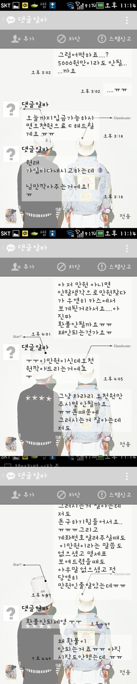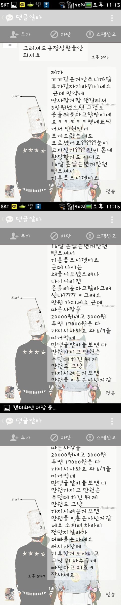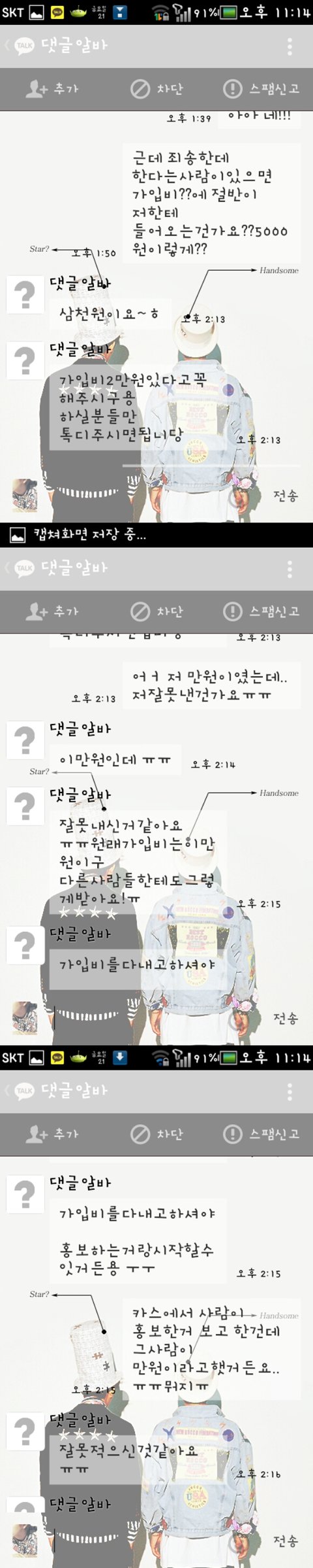 그러다가 댓글알바를 알게됬고 우연히 카ㅋㅇ스토리에서 누가 댓글알바 가입비 10000원인데 할사람있냐고 하고싶은사람 톡아이디적고가라길래 저는 톡아이디랑 궁금한거 물어보고 댓글달았어요. 딴댓글알바들은 가입비가 2만원이던데 2만원은 저에겐 큰돈이라 만원만 찾고있었는데 그때 딱 저 글을 보게되서 신기해하고있었는데 너무후회되네요