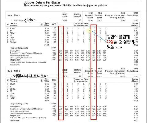 아델리나 소트니코바 3F (기본점 5.30) 가산점 1.2 김연아 3F (기본점 5.30) 가산점 1.1 누가봐도 심판들의 마음은 아델리나에게 치우쳐져있죠. 똑같은 점프에도 아델리나에게는 0.1점의 더 많은 가산점을 주었습니다. 둘의 총점은 아델리나 224.59점이고 김연아선수는 219.11입니다. 연아선수가 예술점수에서는 0.9점 아주 미세하게 앞섰습니다. 하지만 기술점수에서는 아델리나가 김연아선수보다 무려 5.85점이나 더 높은 점수를 받았습니다. 아델리나는 기본 점수에서 높은 평가를 받아 61.43을 받았고 그점수는 김연아선수보다 4점정도 높은 점수이죠. 이미 기본점수에서 차이가 벌어졌는데 거기에 심판들의 가산점때문에 점수차이는 엄청 벌어진거죠. 스텝 시퀀스는 김연아선수는 깔끔히 소화하였는데도 불구하고 레벨 3을고 3.3점을 받았는데 아델리나는 한단계 높은 레벨 4를받으며 3.9를 땄고, 거기에 1.7점의 가산점까지 더 받았습니다. 여기에서도 심판들의 가산점이 후하다고 할수있겠죠. 3.9점에서 그친것이 아니라 1.7 점이라는 높은 가산점까지 준것을 보면요. 연아선수는 108개의 점수중 1점을 41번 받았고 최고점인 3점은 13개입니다. 아델리나는 108개의 점수중 최고점인 3점을 33개나 챙기고 1점은 단 9번밖에 되지 않습니다. 연아선수가 힘들게 노력하고 어려운시간을 버텨내며 얻어낸 세계신기록과 아델리나가 홈버프로 얻은 224.59점와는 오직 4점밖에 차이가 안납니다. 김연아선수가 노력한 그 시간들은 어떻게 되는건가요. 점수표와는 별개로 율리아 리프니츠카야는 점프 실수와 롱엣지를 했는데도 불구하고 오직 1점이라는 감점만 받았을뿐 65.23이라는 후한 점수를 받았습니다. 율리아보다 더 잘한 선수들도 저 점수를 받지 못했습니다. 정말 이건 편파판정이에요. 러시아는 이번을 계기로 전세계에 똥같은 이미지를 심어줬고 아름다웠던 피겨스케이팅의 이미지도 한순간에 안좋아지겠네요. 국민들이 이렇게 서명하는것은 헛된일이 아닙니다. 어쩌면 안될걸 알면서도 정말 작은 희망을 가지고 하는것일수도 있죠. 왜 서명운동을 하냐 하시는분들 아델리나는 자신의 나라에서 평생 자신이 갱신못할 점수를 얻었고 거기에 금메달을 가졌지만 완벽했던 김연아선수는 편파판정으로 인하여 정말 짠 점수를 받았고 은퇴무대를 이렇게 끝냈습니다. 만약 공정한 심사를 했더라면 그 무대는 충분히 연아선수가 보유하고있는 세계신기록에 도달할수 있었을거라고 생각해요. 모두가 원하는건 깨끗한 올림픽이죠 홈버프가 아닙니다. 보신분들 추천한번씩만 꼭 부탁드립니다.