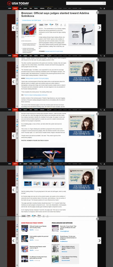 기사 링크 http://www.usatoday.com/story/sports/columnist/brennan/2014/02/21/figure-skating-scandal-sochi-olympics-adelina-sotnikova-yuna-kim/5680717