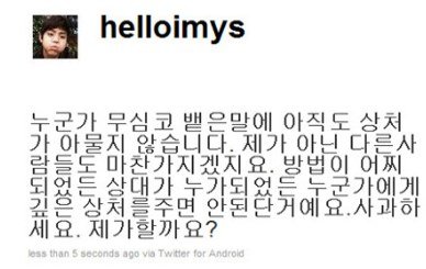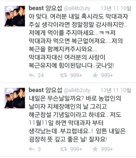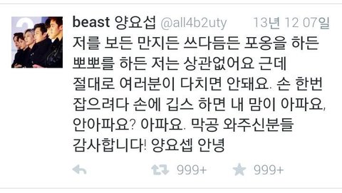 양요섭이 이런 트윗을 올림. 아무리 팬이라도 잘못한게 있으면 따끔하게 혼낼 줄 앎.