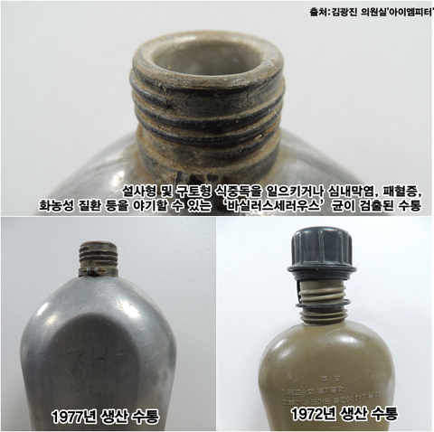 김광진 의원은 사병들이 사용하는 수통이 무려 30년이나 넘도록 사용하고 있어 각종 질환을 일으킬 수 있다며, 사병들의 수통을 바꾸도록 예산을 배정받을 수 있도록 했습니다.