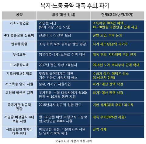 기초연금, 4대 중증질환 진료비, 반값등록금, 고교 전면 무상교육, 맞춤형 기초생활보장제도, 저소득층 영아 지원, 고위험 임산부 지원, 공공기관 정규직 전환, 저임금 비정규직 4대보험 지원, 사회공헌 일자리 대폭 확대 등의 공약에는 대폭 칼을 대거나 아예 뒤집는 방법을 택했다. 언제 그런 약속을 했느냐는 식이었다.