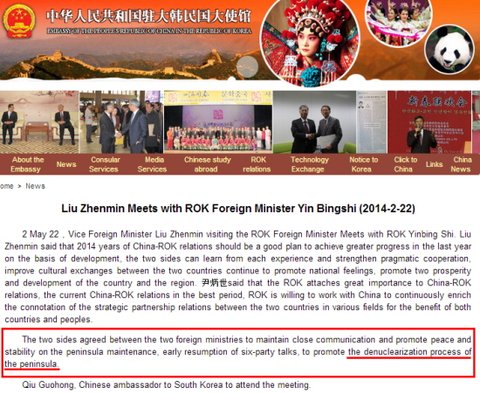바로 이 부분이 한국의 언론에서는 중국이 '북한 핵 불용'을 추구하고 있으며 강력하게(?) 압력을 넣고 있다는 식으로 둔갑되고 있다. 이는 지난번 왕이 중국 외교부장이 존 케리 미 국무장관 면전에서 "한반도에서의 전쟁 발생을 전혀 허용하지 않겠다"고 강력하게 천명한 사실도 중국이 북한의 핵 무기 등 무력 증강이나 도발을 절대 허용하지 않겠다고 언급했다는 식으로 일종의 희망 사항(?)으로 둔갑해 해석하고 있는 것과 마찬가지이다.